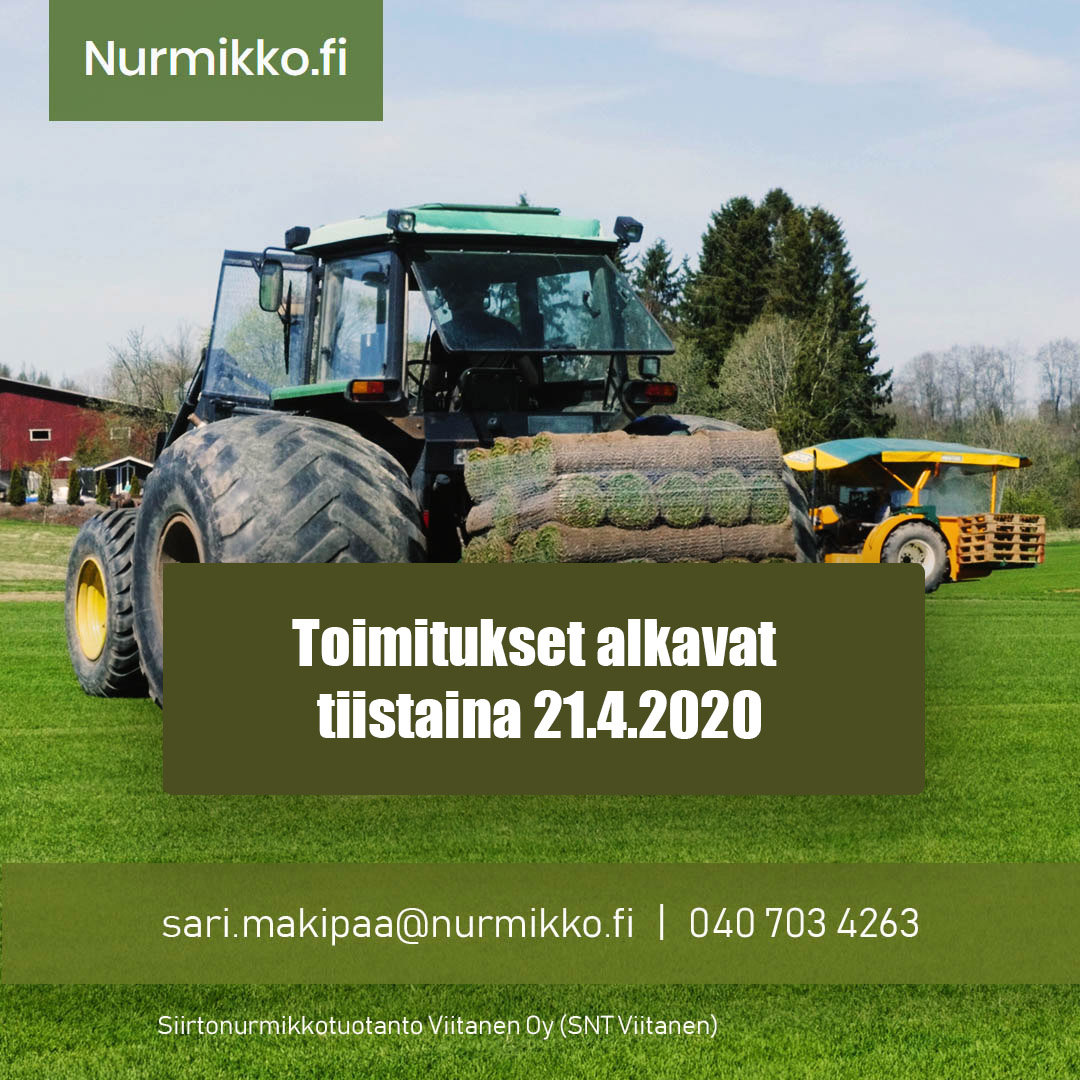 Siirtonurmikon toimitukset alkavat tiistaina 21.4.2019 Aloitamme siirtonurmikon toimitukset ensi tiistaina 21.4.2020. Pyydä tarjousta! By admin|2020-04-17T21:20:57+00:00April 17, 2020|ajankohtaista|Comments Off on Siirtonurmikon toimitukset alkavat tiistaina 21.4.2019 Share This Story, Choose Your Platform! FacebookXBlueskyRedditLinkedInWhatsAppTelegramTumblrPinterestXingEmail About the Author: admin Related Posts TÄRKEÄÄ HUOMIOITAVAA HELTEELLÄ! ☀️ Gallery TÄRKEÄÄ HUOMIOITAVAA HELTEELLÄ! ☀️ Onko nurmikkoosi ilmestynyt röyhyjä? Gallery Onko nurmikkoosi ilmestynyt röyhyjä? Helatorstaista johtuen poikkeukselliset toimitukset viikolla 22 Gallery Helatorstaista johtuen poikkeukselliset toimitukset viikolla 22 Vappu -viikolla (vko 18) toimitukset vain tiistaina ja keskiviikkona Gallery Vappu -viikolla (vko 18) toimitukset vain tiistaina ja keskiviikkona